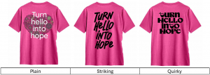HelloHope Product Survey Product QuestionnaireThank you so much for supporting HelloHope!In this short survey, you’ll see a few of our design ideas for new branded products.We’d really value your thoughts on the products, colours, and fonts, as well as any other ideas you’d like to share.Colours of the productsHow do you feel about the colours on our products?Would you change or add any colours? Rate the different colours from 1 (I wouldn't wear this colour) to 5 (I would wear this colour)12345PinkDark GreenBlackLight GreenMessages on the productsWhat do you think about the potential messages on our products?Do you have any ideas for other messages of hope we could include? Rate different messages from 1 (I don't like these messages) to 5 (I really like this message)12345Hope looks good on youTurn hello into hopeDesigned for hopeHope is the new blackThis is what hope looks likeHope looks like thisHope dealerHope never goes out of fashionDesigned by hopeHope never fadesGot your own idea for a hopeful message? Tell us what you’d put!ProductsWhat do you think about the products we’ve shown?Would you like us to add any particular items? Rate different products from 1 (I don't like this product) to 5 (I really like this product)12345HoodieT-ShirtTote BagGot your own idea for a HelloHope product? Tell us what you’d also put in our store!FontsWe’re trying out different fonts on the productsWhat do you think of these fonts? Rate different patterns from 1 (I don't like this product) to 5 (I really like this product)12345NormalStrikingQuirkyBackground imagesWe’re trying out some images to go with the messages on our products.What do you think of these pictures? Rate different patterns from 1 (I don't like this product) to 5 (I really like this product)12345PlainMetal HeartsPaper BirdFlower HeartWhich age range are you in? 18 or younger 18 to 25 25 to 35 35 to 45 45 to 55 55 and overWhich gender identity do you go by? Male Female Non-Binary OtherSubmit Form